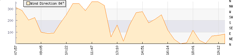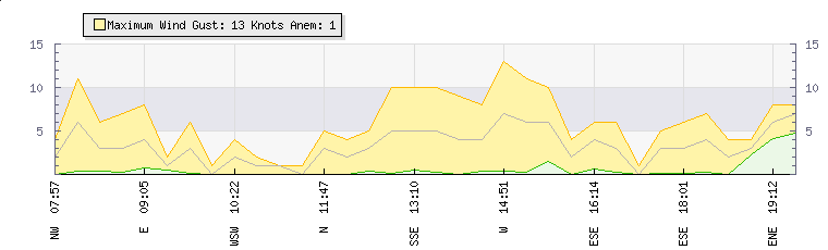 In the last few minutes the wind was South Easterly at an average speed of 9 knots, reaching up to 18 knots and a low of 1 knots. The gust strength is17 knots above the minimum speed |