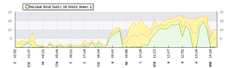 In the last few minutes the wind was Westerly at an average speed of 13 knots, reaching up to 16 knots and a low of 10 knots. The gust strength is6 knots above the minimum speed |