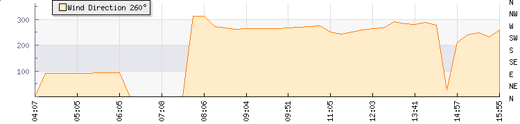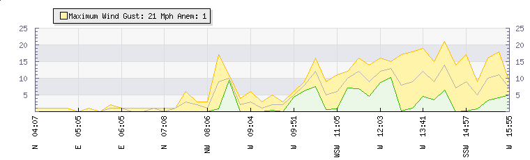 In the last few minutes the wind was East South East at an average speed of 5 mph, reaching up to 10 mph and a low of 0 mph. The gust strength is10 mph above the minimum speed |