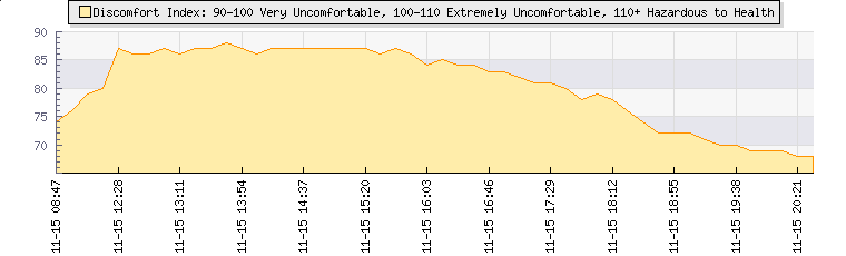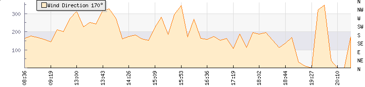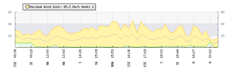 In the last few minutes the wind was East South East at an average speed of 13 kmh, reaching up to 25 kmh and a low of 1 kmh. The gust strength is24 kmh above the minimum speed |