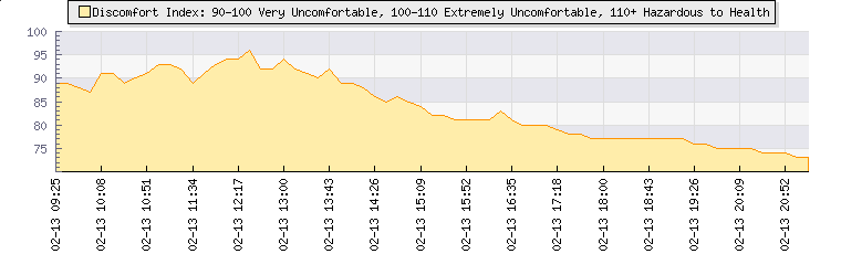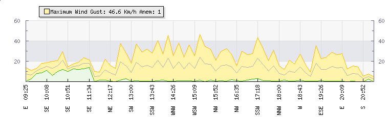 In the last few minutes the wind was Easterly at an average speed of 14 kmh, reaching up to 27 kmh and a low of 1 kmh. The gust strength is26 kmh above the minimum speed |