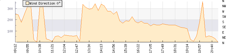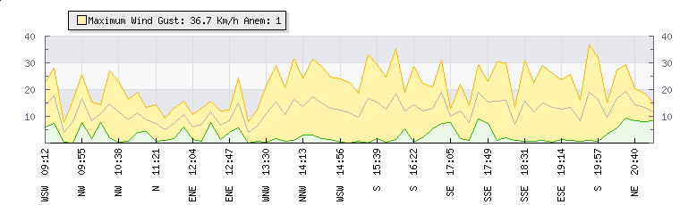 In the last few minutes the wind was South South East at an average speed of 16 kmh, reaching up to 30 kmh and a low of 2 kmh. The gust strength is28 kmh above the minimum speed |
