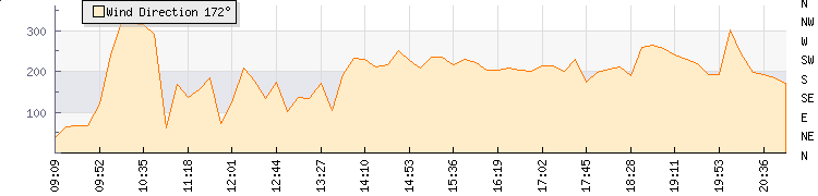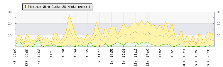 In the last few minutes the wind was South Westerly at an average speed of 11 knots, reaching up to 21 knots and a low of 0 knots. The gust strength is21 knots above the minimum speed |
