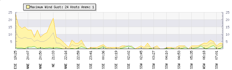In the last few minutes the wind was South South West at an average speed of 1 knots, reaching up to 1 knots and a low of 0 knots. The gust strength is1 knots above the minimum speed |