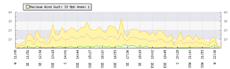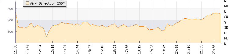 In the last few minutes the wind was South South West at an average speed of 5 mph, reaching up to 9 mph and a low of 1 mph. The gust strength is8 mph above the minimum speed |