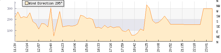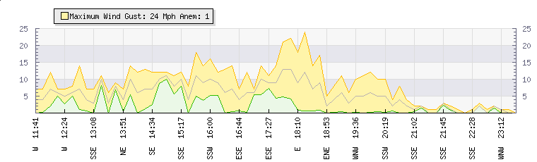 In the last few minutes the wind was South South East at an average speed of 1 mph, reaching up to 1 mph and a low of 0 mph. The gust strength is1 mph above the minimum speed |