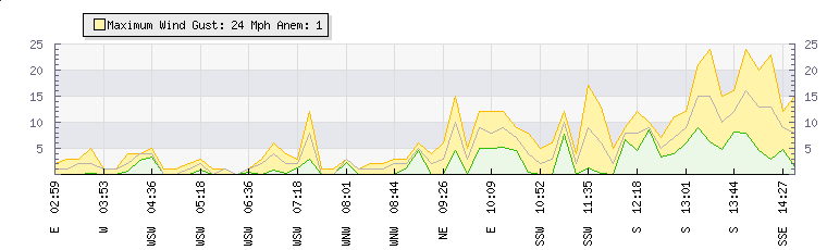 In the last few minutes the wind was Southerly at an average speed of 15 mph, reaching up to 21 mph and a low of 9 mph. The gust strength is12 mph above the minimum speed |