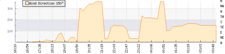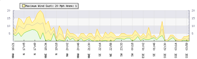 In the last few minutes the wind was South South East at an average speed of 1 mph, reaching up to 1 mph and a low of 0 mph. The gust strength is1 mph above the minimum speed |