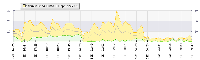In the last few minutes the wind was North Westerly at an average speed of 4 mph, reaching up to 4 mph and a low of 3 mph. The gust strength is1 mph above the minimum speed |