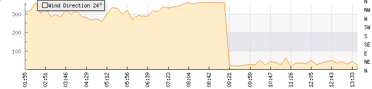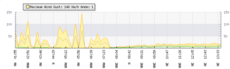 In the last few minutes the wind was North North East at an average speed of 13 kmh, reaching up to 18 kmh and a low of 7 kmh. The gust strength is11 kmh above the minimum speed |