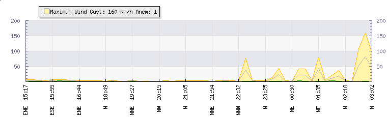 In the last few minutes the wind was North North East at an average speed of 4 kmh, reaching up to 6 kmh and a low of 1 kmh. The gust strength is5 kmh above the minimum speed |