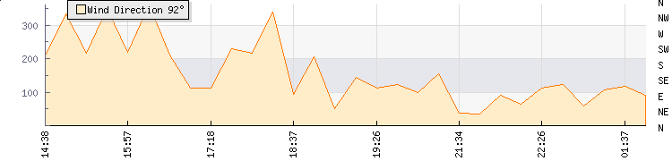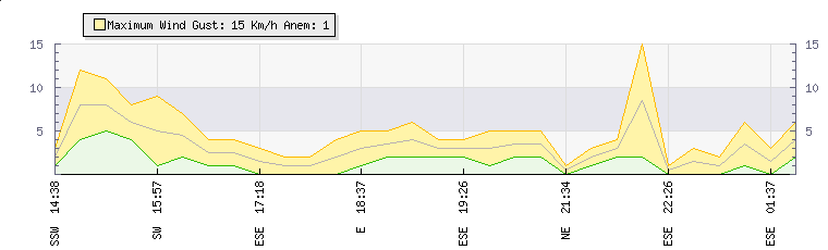 In the last few minutes the wind was South Westerly at an average speed of 5 kmh, reaching up to 9 kmh and a low of 1 kmh. The gust strength is8 kmh above the minimum speed |