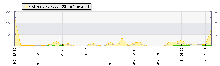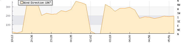 In the last few minutes the wind was South South West at an average speed of 12 kmh, reaching up to 15 kmh and a low of 8 kmh. The gust strength is7 kmh above the minimum speed |