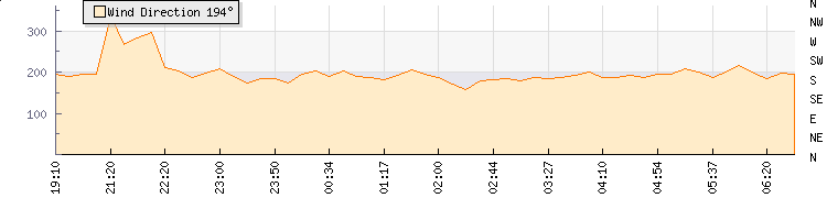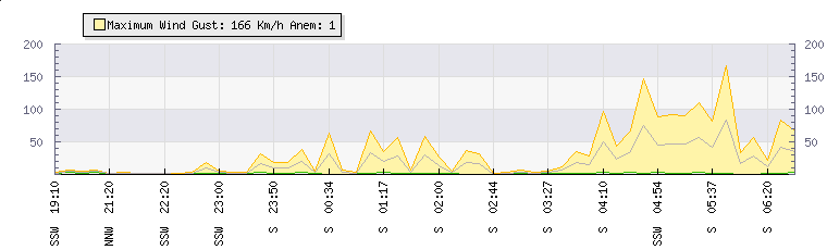 In the last few minutes the wind was Southerly at an average speed of 42 kmh, reaching up to 81 kmh and a low of 2 kmh. The gust strength is79 kmh above the minimum speed |