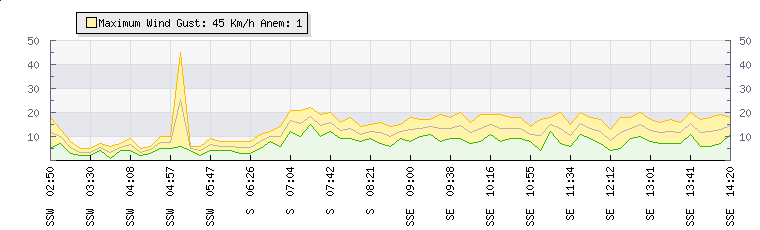 In the last few minutes the wind was South Easterly at an average speed of 13 kmh, reaching up to 17 kmh and a low of 8 kmh. The gust strength is9 kmh above the minimum speed |