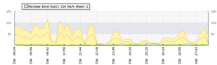 In the last few minutes the wind was South South West at an average speed of 17 kmh, reaching up to 29 kmh and a low of 5 kmh. The gust strength is24 kmh above the minimum speed |