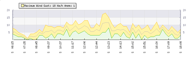 In the last few minutes the wind was Southerly at an average speed of 8 kmh, reaching up to 12 kmh and a low of 3 kmh. The gust strength is9 kmh above the minimum speed |