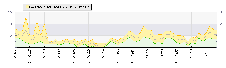 In the last few minutes the wind was Southerly at an average speed of 10 kmh, reaching up to 12 kmh and a low of 7 kmh. The gust strength is5 kmh above the minimum speed |