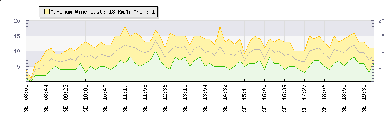 In the last few minutes the wind was South Easterly at an average speed of 8 kmh, reaching up to 11 kmh and a low of 4 kmh. The gust strength is7 kmh above the minimum speed |