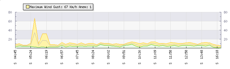 In the last few minutes the wind was Southerly at an average speed of 6 kmh, reaching up to 9 kmh and a low of 2 kmh. The gust strength is7 kmh above the minimum speed |