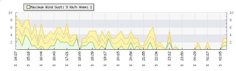 In the last few minutes the wind was Southerly at an average speed of 0 kmh, reaching up to 0 kmh and a low of 0 kmh. The gust strength is0 kmh above the minimum speed |