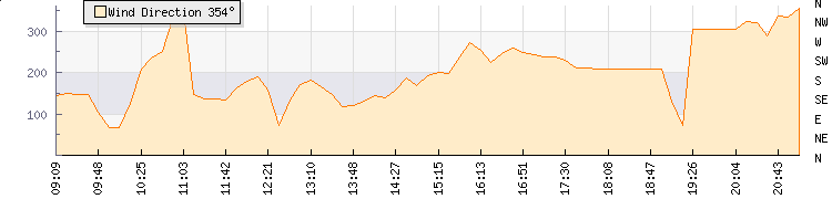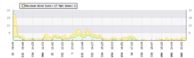 In the last few minutes the wind was South Westerly at an average speed of 2 mph, reaching up to 3 mph and a low of 1 mph. The gust strength is2 mph above the minimum speed |