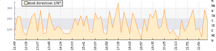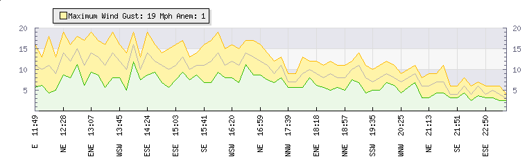In the last few minutes the wind was Southerly at an average speed of 7 mph, reaching up to 11 mph and a low of 4 mph. The gust strength is7 mph above the minimum speed |
