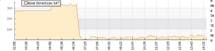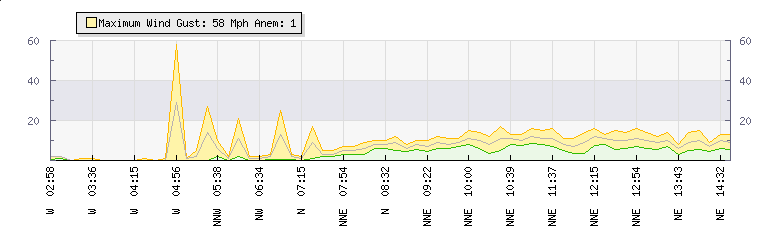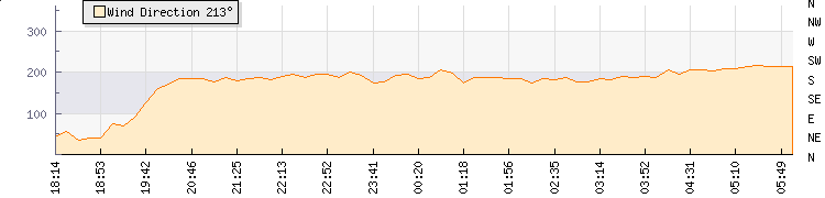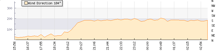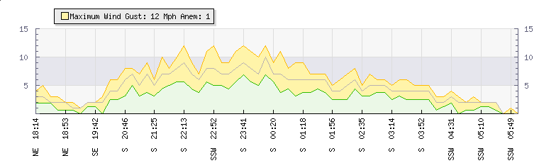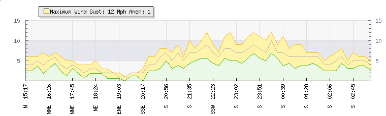 In the last few minutes the wind was South South East at an average speed of 7 mph, reaching up to 10 mph and a low of 3 mph. The gust strength is7 mph above the minimum speed |