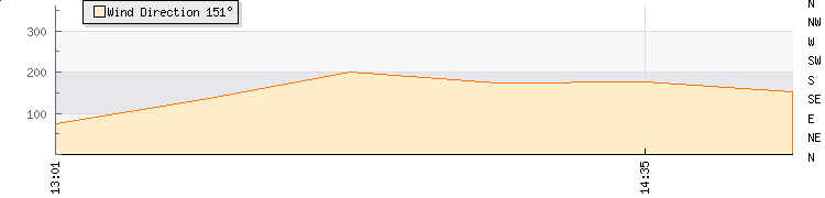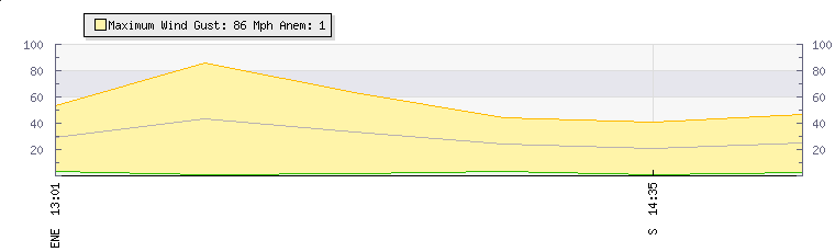 In the last few minutes the wind was South South East at an average speed of 25 mph, reaching up to 47 mph and a low of 2 mph. The gust strength is45 mph above the minimum speed |