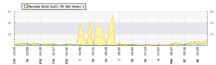 In the last few minutes the wind was North North East at an average speed of 6 mph, reaching up to 8 mph and a low of 3 mph. The gust strength is5 mph above the minimum speed |