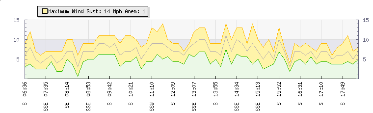 In the last few minutes the wind was South South West at an average speed of 6 mph, reaching up to 9 mph and a low of 4 mph. The gust strength is5 mph above the minimum speed |