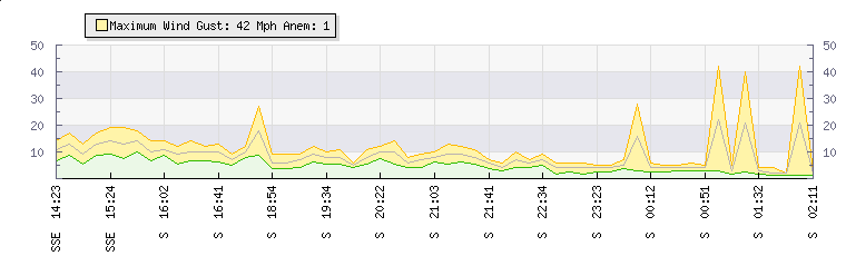 In the last few minutes the wind was Southerly at an average speed of 4 mph, reaching up to 6 mph and a low of 2 mph. The gust strength is4 mph above the minimum speed |