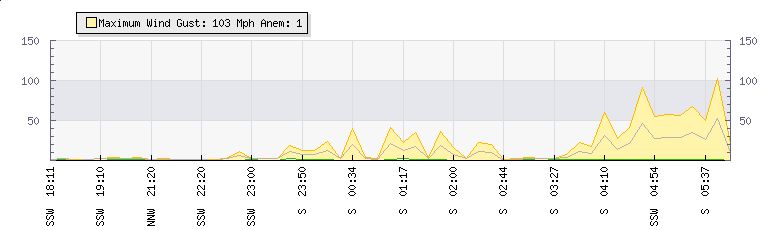 In the last few minutes the wind was Southerly at an average speed of 46 mph, reaching up to 91 mph and a low of 1 mph. The gust strength is90 mph above the minimum speed |