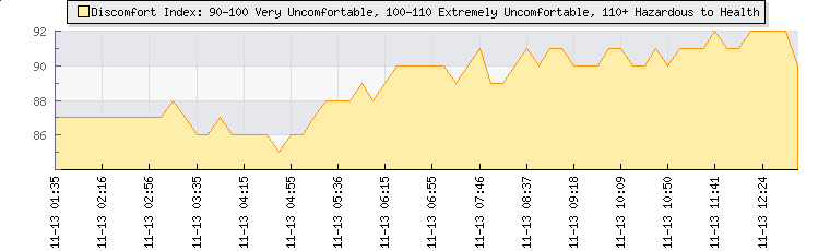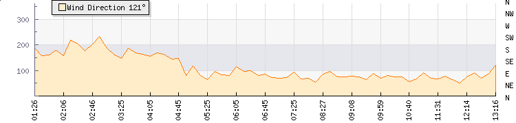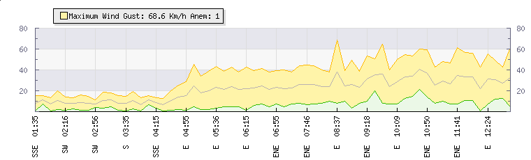 In the last few minutes the wind was East North East at an average speed of 29 kmh, reaching up to 48 kmh and a low of 10 kmh. The gust strength is38 kmh above the minimum speed |
