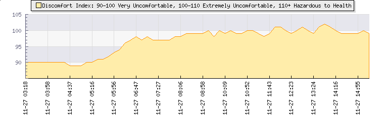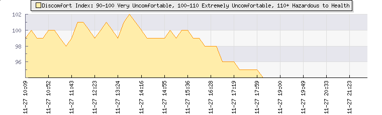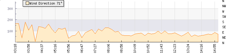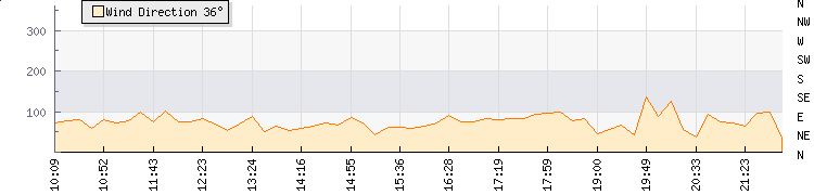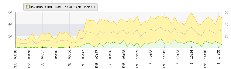 In the last few minutes the wind was East North East at an average speed of 23 kmh, reaching up to 38 kmh and a low of 7 kmh. The gust strength is31 kmh above the minimum speed |