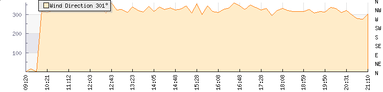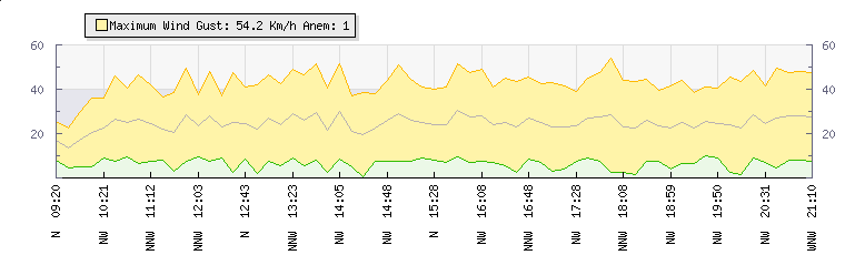 In the last few minutes the wind was North North West at an average speed of 24 kmh, reaching up to 45 kmh and a low of 3 kmh. The gust strength is42 kmh above the minimum speed |