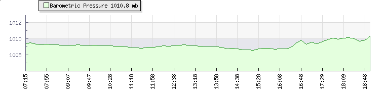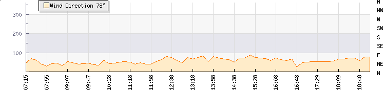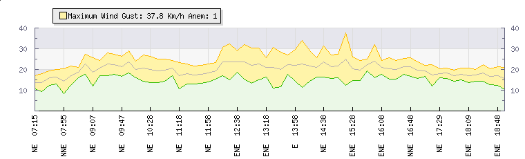 In the last few minutes the wind was North Easterly at an average speed of 18 kmh, reaching up to 21 kmh and a low of 16 kmh. The gust strength is5 kmh above the minimum speed |