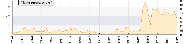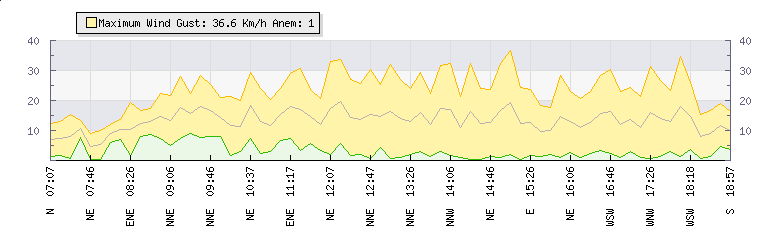 In the last few minutes the wind was South Westerly at an average speed of 14 kmh, reaching up to 27 kmh and a low of 1 kmh. The gust strength is26 kmh above the minimum speed |