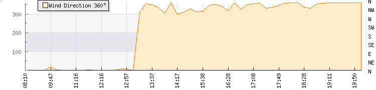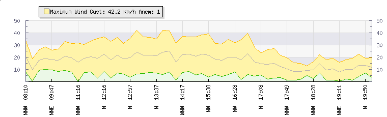 In the last few minutes the wind was Northerly at an average speed of 9 kmh, reaching up to 13 kmh and a low of 5 kmh. The gust strength is8 kmh above the minimum speed |