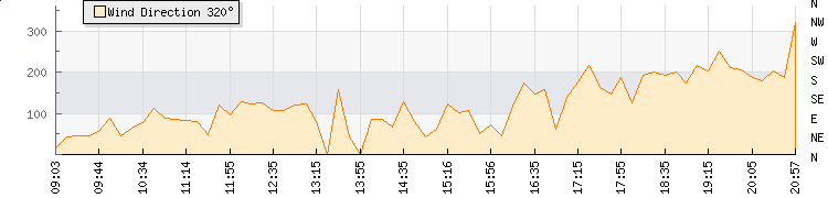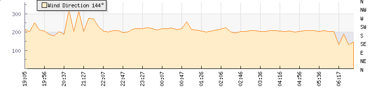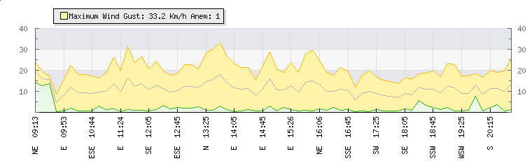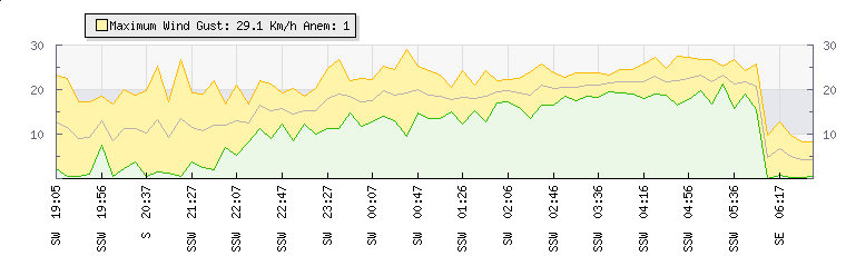 In the last few minutes the wind was South South West at an average speed of 22 kmh, reaching up to 24 kmh and a low of 19 kmh. The gust strength is5 kmh above the minimum speed |