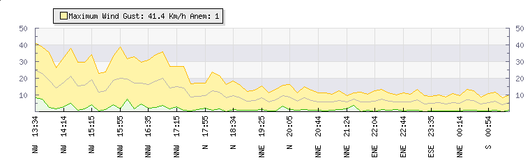 In the last few minutes the wind was North North East at an average speed of 6 kmh, reaching up to 11 kmh and a low of 0 kmh. The gust strength is11 kmh above the minimum speed |