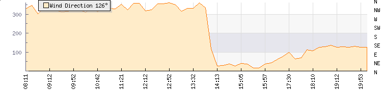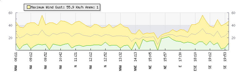 In the last few minutes the wind was East South East at an average speed of 25 kmh, reaching up to 41 kmh and a low of 9 kmh. The gust strength is32 kmh above the minimum speed |