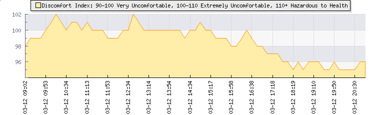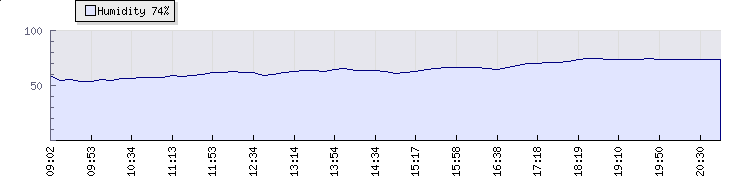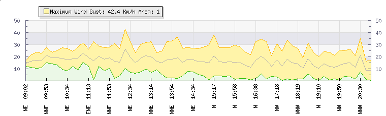 In the last few minutes the wind was North Westerly at an average speed of 12 kmh, reaching up to 24 kmh and a low of 1 kmh. The gust strength is23 kmh above the minimum speed |