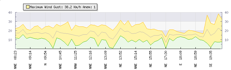 In the last few minutes the wind was North North East at an average speed of 15 kmh, reaching up to 20 kmh and a low of 11 kmh. The gust strength is9 kmh above the minimum speed |