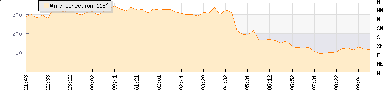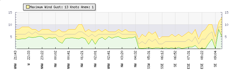 In the last few minutes the wind was East South East at an average speed of 4 knots, reaching up to 7 knots and a low of 1 knots. The gust strength is6 knots above the minimum speed |