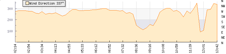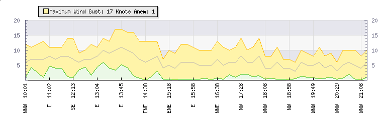 In the last few minutes the wind was Easterly at an average speed of 5 knots, reaching up to 11 knots and a low of 0 knots. The gust strength is11 knots above the minimum speed |
