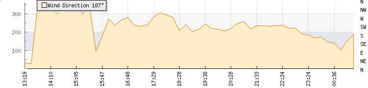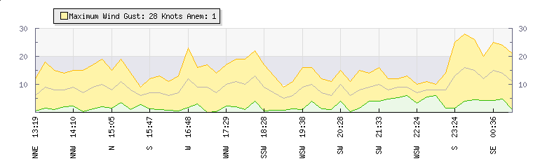 In the last few minutes the wind was South South East at an average speed of 16 knots, reaching up to 28 knots and a low of 4 knots. The gust strength is24 knots above the minimum speed |