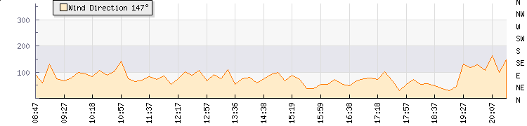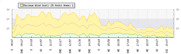 In the last few minutes the wind was East North East at an average speed of 13 knots, reaching up to 23 knots and a low of 2 knots. The gust strength is21 knots above the minimum speed |