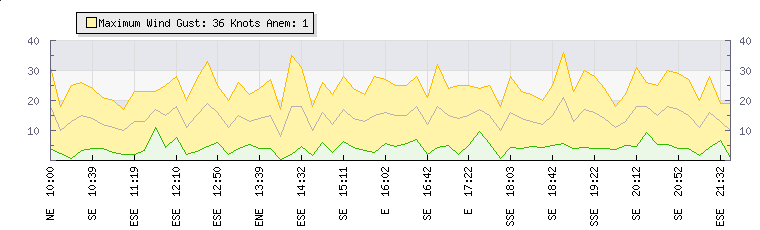 In the last few minutes the wind was South Easterly at an average speed of 13 knots, reaching up to 22 knots and a low of 5 knots. The gust strength is17 knots above the minimum speed |