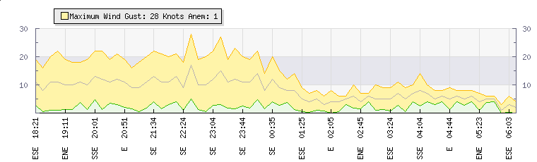 In the last few minutes the wind was Easterly at an average speed of 5 knots, reaching up to 9 knots and a low of 1 knots. The gust strength is8 knots above the minimum speed |